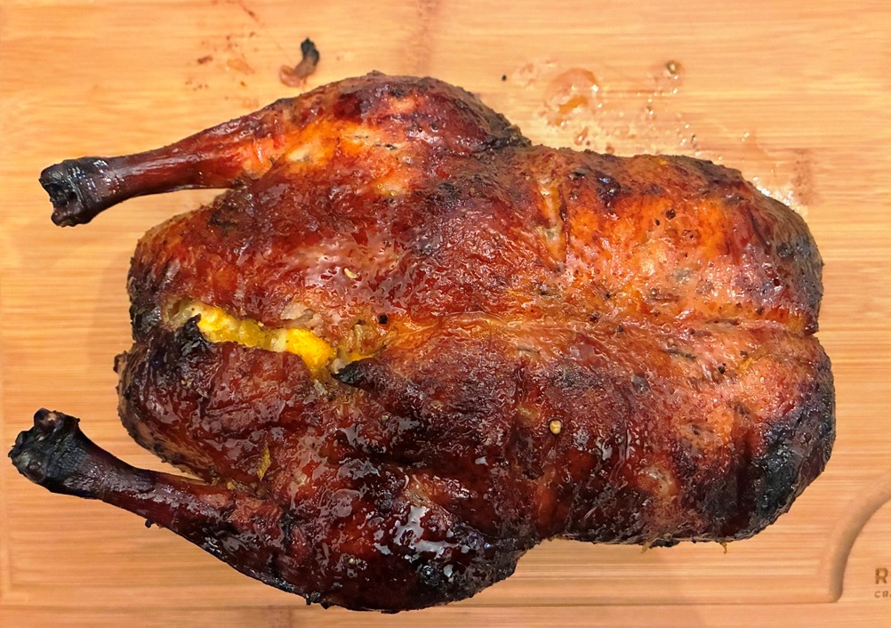 全鴨一隻,約 4.5 磅 兩個柳橙 1/2 cup 細砂糖 6 tbsp 白酒醋或 cider vinegar 1/2 cup Grand Marnier 或其他柳橙利口酒 鹽,胡椒 冷凍的全鴨在冰箱退冰一天左右,不用完全退冰。內臟清乾淨,放入大鍋或是盆中,燒開約兩公升的水,淋遍鴨子表面所有地方,浸泡約三十秒到一分鐘,水倒掉,把鴨子用烤架架起懸空,放在烤盤上。如果做中式調味,可先用約 2 tbsp 生抽加兩粒八角和肉桂用小鍋在一小時前燒開浸泡入味,再把醬油醬汁均勻塗抹在鴨皮表面。淋熱水的作用是讓鴨皮膨脹,烤後比較好看,應該也比較好吃。整隻鴨處理好之後放進冰箱24小時讓表皮乾燥。 烤前兩三小時把鴨從冰箱取出回復室溫,用叉子在鴨皮上刺出多個小洞,用鹽與胡椒抹在表面和內部,腹內可塞入對切開的柳橙與洋蔥各一個,把開口處縫合,鴨腿用棉線綁緊,尖端用鋁箔包住避免烤焦。 烤箱預熱 350°F,鴨放進烤盤,鴨胸面朝上,烤半小時。 烤的同時製作柳橙塗醬: 用削皮刀削下柳橙皮,儘量寬,然後兩三片疊起用刀切成細絲。削皮後的柳橙榨汁。 糖和醋放進厚的耐高溫小湯鍋,攪拌讓糖融化。爐子開大火,不要攪拌,直到糖醋汁變成深棕色。鍋子離火,小心慢慢鹽鍋邊倒進柳橙汁,搖晃使其混合,上爐開火煮沸,加進柳橙皮絲與橙酒,轉小火燒三分鐘。 半小時後取出鴨子翻面,再烤半小時。 一小時候兩面都已烤過,取出塗醬,兩面塗均勻,再翻面至鴨胸朝上,烤半小時後取出再塗醬翻面,再烤半小時。 總共以 350 度烤兩小時,取出靜置十五分鐘至半小時,切片上桌。